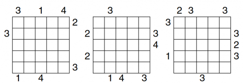 Zad. 1. Na każdej planszy ustaw piramidy o wysokościach od 1 do 5 (wpisując w pole liczbę oznaczającą wysokość piramidy, która na nim stoi) tak, aby w każdym wierszu i kolumnie stały piramidy różnych wysokości. Liczby na obrzeżach diagramów oznaczają, ile piramid widać w danym rzędzie, patrząc z miejsca z liczbą. Oczywiście wyższe piramidy zasłaniają niższe. W odpowiedzi podaj ustawienia piramid w środkowym wierszu (czytając od lewej) i w środkowej kolumnie (czytając od góry).