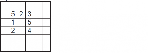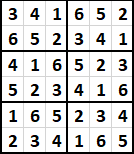 Zad. 1. Rozwiąż łamigłówkę typu sudoku. W każde pole diagramu wpisz jedną z cyfr od 1 do 6 tak, aby w każdym rzędzie, w każdej kolumnie i w każdym obwiedzionym grubszą linią obszarze każda cyfra występowała dokładnie raz. Dodatkowy warunek jest taki, że pola z tymi samymi liczbami nie mogą stykać się wierzchołkami.