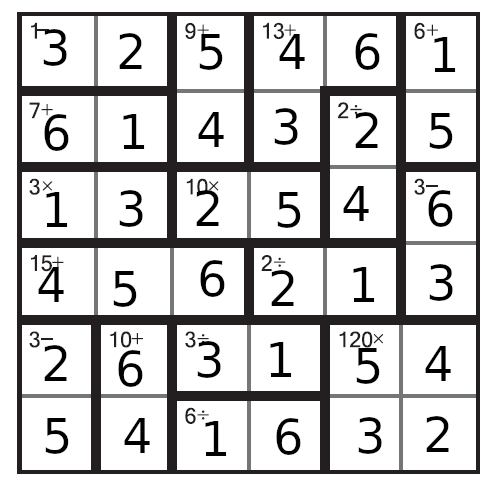 Zad. 1. W pola diagramu wpisz cyfry od 1 do 6, tak aby nie powtarzały się w wierszach ani w kolumnach (ale w zakręcających pogrubionych obszarach mogą). Każdy pogrubiony obszar powinien zawierać cyfry, które w rezultacie podanego w tym obszarze działania, dają podany w tym obszarze wynik, (np. w obszarze oznaczonym "2:" można wpisać 6:3 albo 4:2 albo 2:1). Kolejność cyfr w obrębie obszaru nie ma znaczenia.