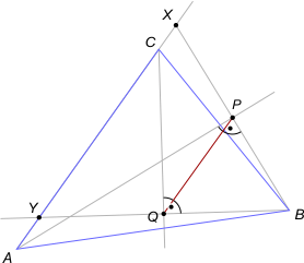 Zad. 1. W trójkącie ABC poprowadzono dwusieczne kątów A i C. Niech P i Q oznaczają rzuty prostokątne wierzchołka B na te dwusieczne. Wykaż, że odcinek PQ jest równoległy do boku AC.