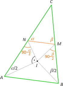 Zad. 1. W trójkącie ABC punkt I jest środkiem okręgu wpisanego, a M i N są środkami boków odpowiednio BC i AC. Wiedząc, że kąt AIN jest prosty, wykaż, że kąt BIM także jest prosty.