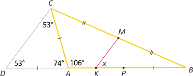 Zad. 3. Niech D będzie takim punktem prostej AB, że A leży między B i D oraz |AD| = |AC| = |PB|. Wówczas punkt K jest środkiem odcinka DB, a KM jest linią średnią trójkąta DBC równoległą do boku DC. W trójkącie równoramiennym DAC mamy kąty o miarach 74°, 53° i 53°, stąd |∡MKB| = 53°.