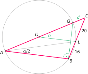 Zad. 4. (wolna amerykanka) W trójkącie ABC poprowadzono dwusieczną AL. Wiadomo, że |BL|=16 i |CL|=20, a środek okręgu opisanego na trójkącie ABL leży na odcinku AC. Oblicz długość AB.